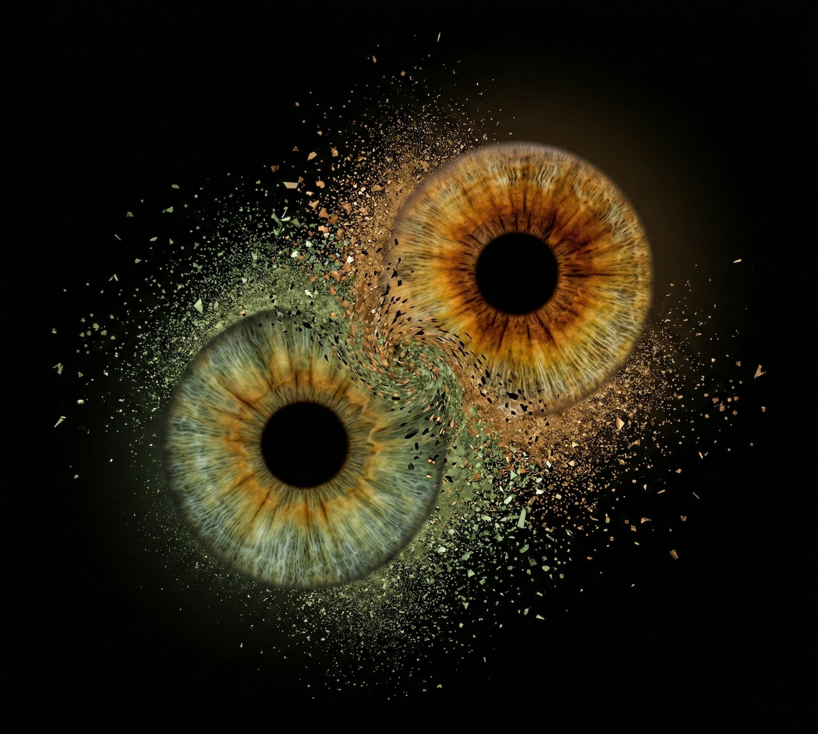 Each particle inherits the exact colour of the iris it came from, warm tones from one eye, cooler tones from the other and at the intersection those distinct grains swirl together, intermingling without ever turning muddy.